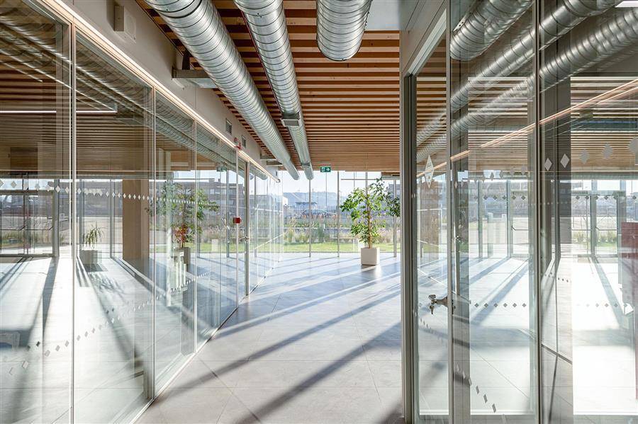 有别于其他对称型悬挑屋顶,通过对当地太阳方向、日照分析,设计采用不同距离的悬挑,以便根据日照和室内空间的需求来灵活管理光线的直射。这一功能性的独特设计赋予了建筑高度的可识别性,成为摩德纳的绿色新地标。